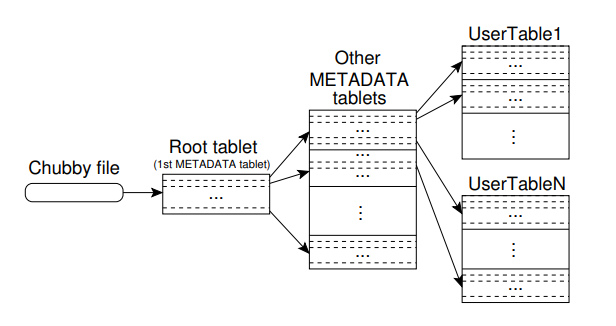 - Root tablet: contains all Metadata tablet location
