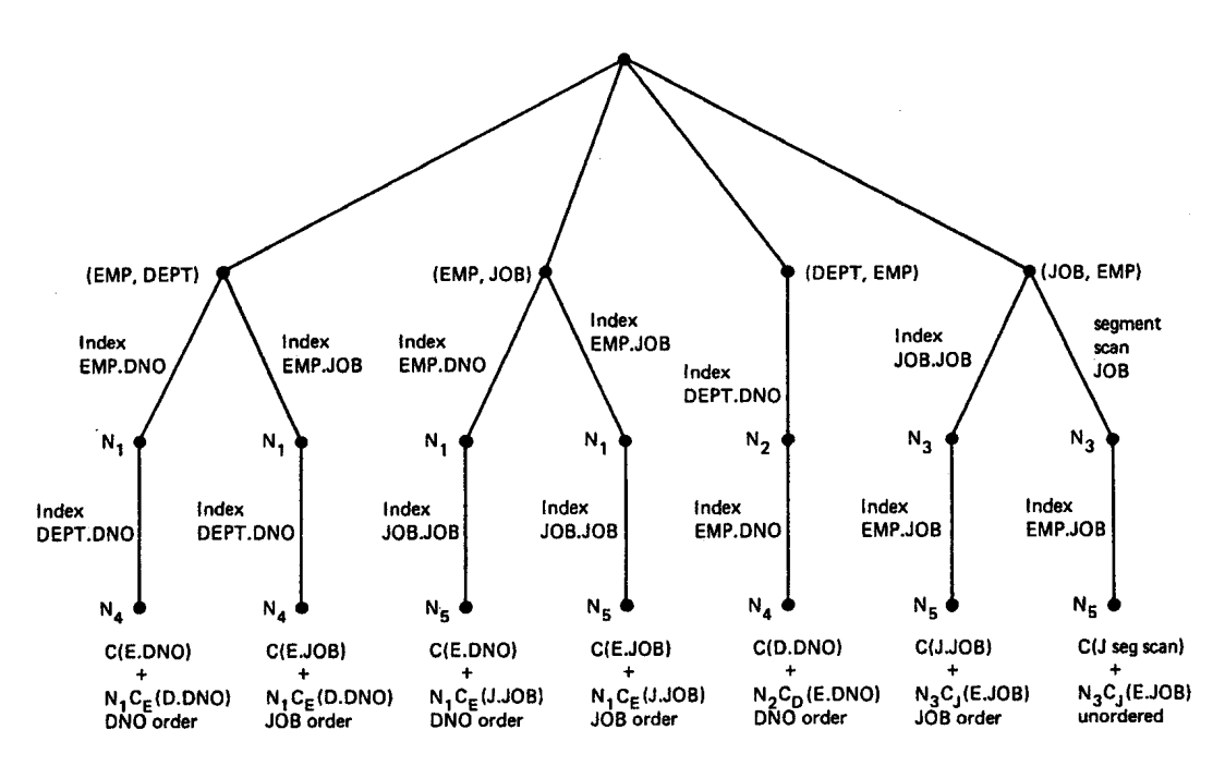 - 剪枝: cartesian products should perform late (Join relations with join predicates between first)